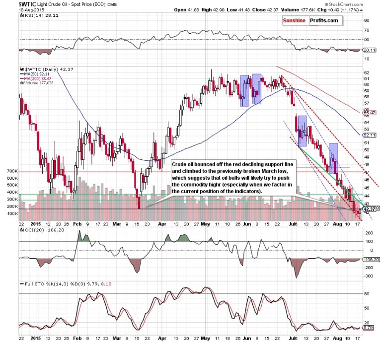 From today's point of view we see that although crude oil moved little lower after the market's open, the combination of the recent multi-month low and the key support line (marked with red) encouraged oil bulls to act. As a result, light crude rebounded and climbed above the previously-broken March low, hitting an intraday high of $42.90.