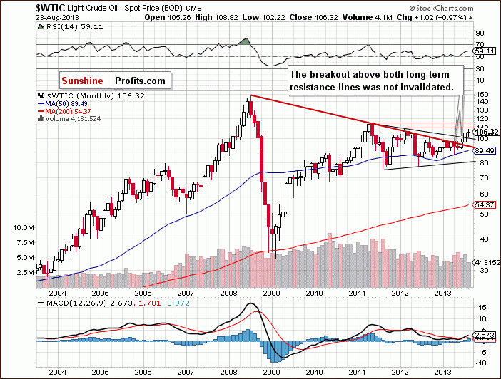 To have a more complete picture of the current situation in the oil market, we take a look at the charts from different time perspectives. Let’s start with a look at the monthly chart of light crude (charts courtesy by http://stockcharts.com).