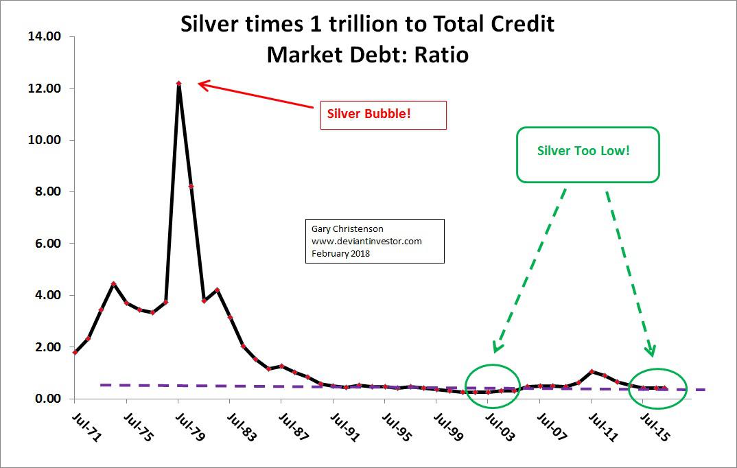 The ratio of silver prices (times one trillion) to total credit market debt shows debt has increased more than silver prices. One should conclude the “powers-that-be” encourage debt and discourage silver.