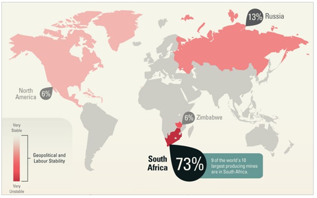 South Africa is the primary location of platinum mining, providing about 73% of the global supply (see Figure 5). Additional supply comes from Russia, Canada, Zimbabwe and the U.S.