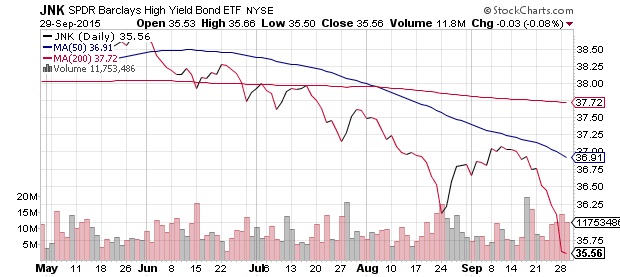 It's not surprising that the commodities crash would impact the bonds of coal and oil companies. The big question is whether the carnage spreads to other kinds of junk. And over the last couple of months it has. The chart below shows the price of a junk bond ETF that last week plunged through the lows of the August mini-panic.