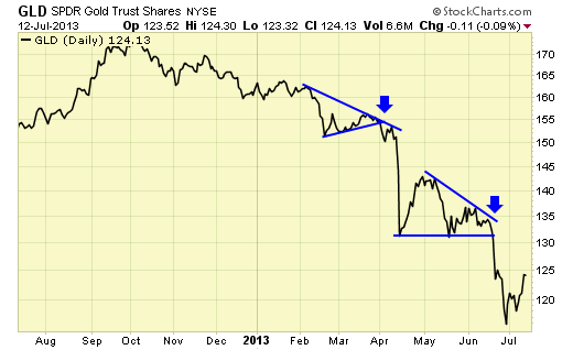 The decline in gold prices this year has been classically bearish. Each sharp drop is followed by a consolidation before another sharp drop, thus trapping buyers who have been trying to pick a bottom. This pattern has to change before one can become a confident buyer.