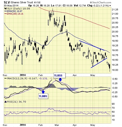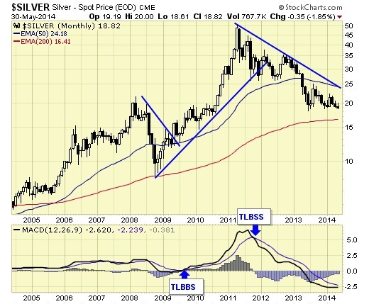 Silver remains on major sell signal, however, prices are near 200ema support and a major buy signal can materialize in the months ahead.