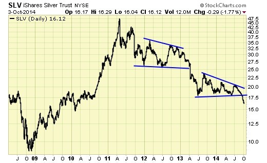 SLV broke down decisively from a multi month consolidation, and the long term trend remains firmly down.
