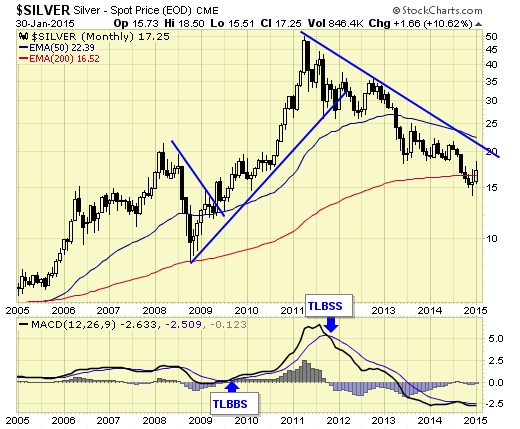 Silver remains on major sell signal, however, prices are now at 200ema support and a major buy signal can materialize in the months ahead.