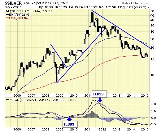 Silver remains on major sell signal, however, prices are now at 200ema support and a major buy signal can materialize in the months ahead.