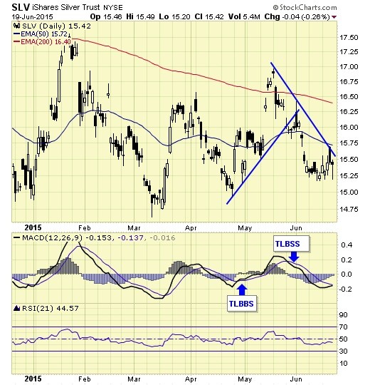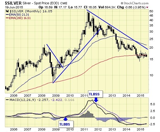 Silver remains on major sell signal, however, prices are now at 200ema support and a major buy signal can materialize in the months ahead.
