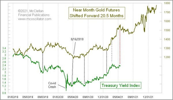 The relationship says that bond yields should be reaching a temporary top right about now. The next few months should see a gentle retreat for interest rates, lasting until a bottom due around mid-August 2021. Then a much bigger rise in interest rates is set to commence, if gold’s message continues to be correct about the timing of moves in interest rates.