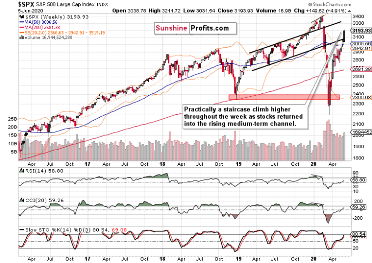 Friday's key development was the breakout above the upper border of the bearish wedge (thin red lines connecting April tops at its upper border, and May bottoms at is lower border). The move happened on the highest volume since the start of April, and on fundamentally positive news for the real economy. Is the party just getting started, or the fat lady is about to sing any moment now?