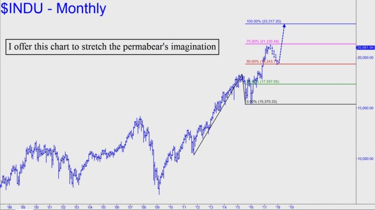 Permabears in particular will find this hard to believe, but the Dow Industrial Average could levitate a further 2336 points before it hits something solid. Even some bulls might find the 23317 target shown in the chart (see inset) a tad optimistic. But charts don’t lie, and in this case the force with which the Indoos impaled the red line, a midpoint Hidden Pivot resistance at 19343, makes a run-up to 23317 a good bet as far as I’m concerned.