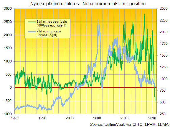 Speculators in New York-traded platinum futures and options have recently built a record short position, betting against the metal recovering from its recent plunge to 14-year lows beneath $800 per ounce.
