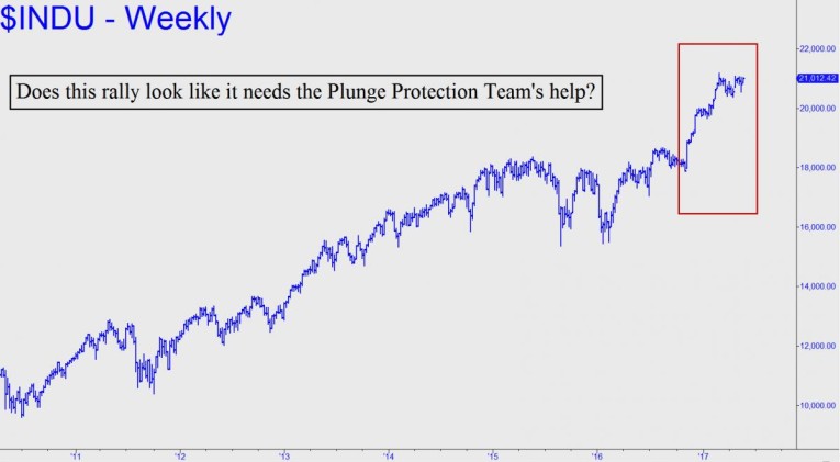 Zillionaire Asher Edelman was quoted on ZeroHedge the other day saying he has ‘no doubt’ that the Plunge Protection Team is behind the stock market’s steep rally since the election. With all due respect for Mr. Edelman and others who believe this, it is conspiracist poppycock. Yes, the Plunge Protection Team, which is officially known as the Working Group on Financial Markets, does exist, having been created under President Reagan. And I have no doubt that it will be pressed into action some day when the inevitable avalanche hits Wall Street. But the source of the stock market’s ongoing buoyancy at present is not the PPT, which has no reason to act unless there’s a crisis, but rather the unlimited sums of credit available at zero or near-zero interest rates to institutional investors and to companies that continuously buy back their own stock to artificially inflate earnings per share.