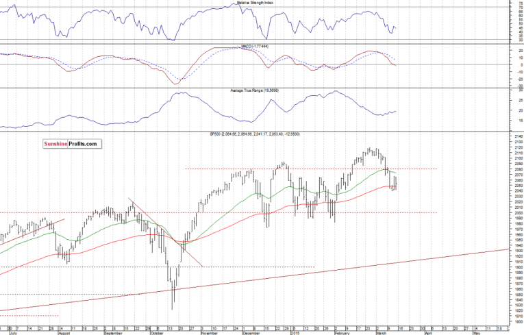 The U.S. stock market indexes lost 0.5-0.8% on Friday, extending their short-term fluctuations following recent move down. The S&P 500 index continues to trade along the level of 2,050. There have been no confirmed short-term positive signals so far. The nearest important level of resistance is at around 2,060-2,065, marked by local highs. On the other hand, support level is at 2,040, as we can see on the daily chart: