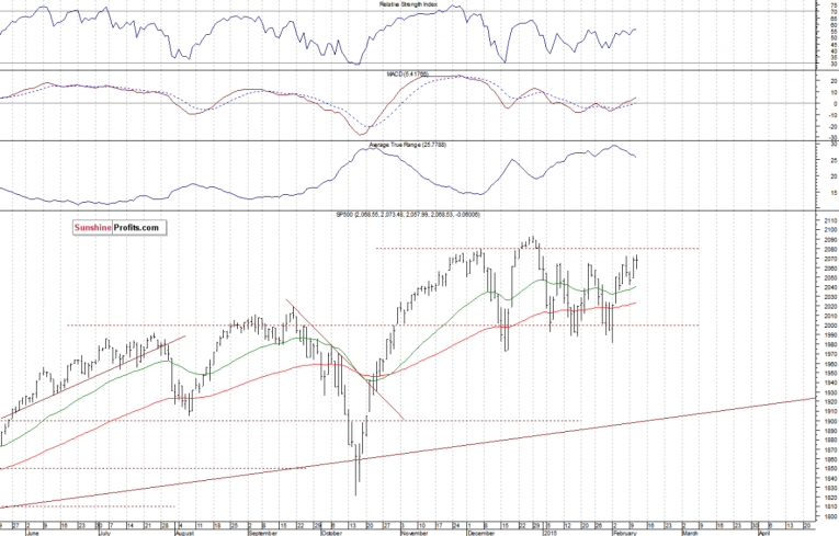 The U.S. stock market indexes were mixed between 0.0% and +0.4% on Wednesday, as investors remained uncertain following recent move up. Our yesterday's neutral intraday outlook has proved accurate. The S&P 500 index continues to fluctuate within its three-month long consolidation. The nearest important level of resistance is at around 2,080-2,100, marked by the December 29th all-time high of 2,093.55, among others. On the other hand, support level remains at 2,040-2,050, marked by recent local lows, as we can see on the daily chart: