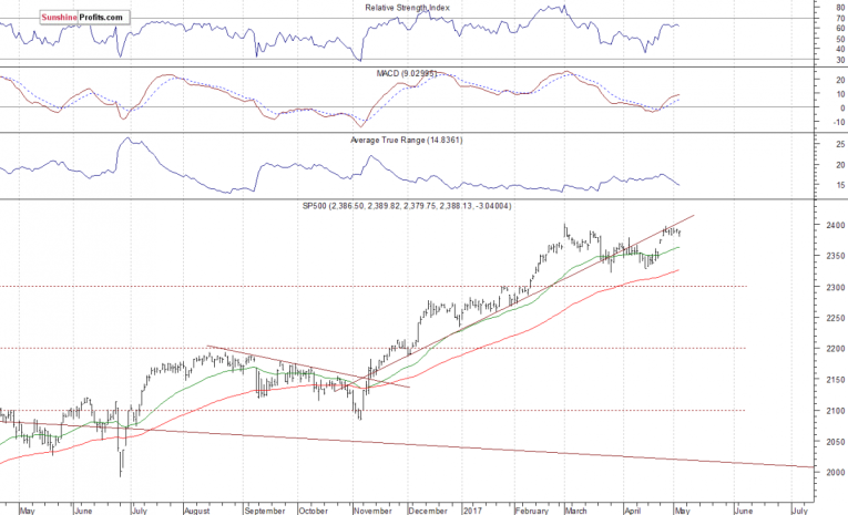 The U.S. stock market indexes were mixed between -0.3% and 0.0% on Wednesday, extending their short-term consolidation, as investors reacted to economic data including the FOMC Rate Decision announcement, quarterly corporate earnings releases. The S&P 500 index remains close to its March 1 all-time high of 2,400.98. It has closed around 0.5% below that record high on Wednesday. Will the broad stock market index continue its eight-year-long bull market? The Dow Jones Industrial Average remained below the level of 21,000, and the technology Nasdaq Composite index fluctuated slightly below the level of 6,100, along its new record high. The nearest important level of support of the S&P 500 index remains at 2,375-2,380, marked by last Tuesday's daily gap up of 2,376.98-2,381.15. The next support level is at 2,355-2,370, marked by last Monday's daily gap up. The support level is also at around 2,350, marked by short-term consolidation. On the other hand, the nearest important level of resistance is at 2,400, marked by record high, among others. We can see some volatility following five-month-long rally off last year's November low at around 2,100. Is this a topping pattern before medium-term downward reversal? The uptrend accelerated on March 1 and it looked like a blow-off top pattern accompanied by some buying frenzy. The S&P 500 index is currently trading along its medium-term upward trend line, as we can see on the daily chart: