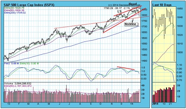 For the formation to be somewhat symmetrical the bounce would have to be fairly shallow and with a duration of several weeks. If the head and shoulders breaks down after the right shoulder has formed, the minimum downside target would be about 1700. As I said, this is only one possible scenario, but things are pretty well aligned for that outcome. But first things first. Let's see if there is a bounce next week.
