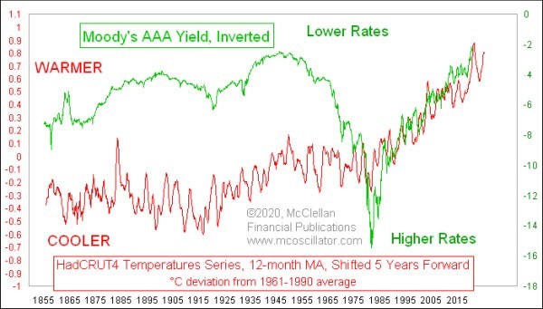 It shows an inverted plot of Moody’s Aaa corporate bond yield, with proxy data for the years before Moody’s began that series in 1919. Also in that chart is a plot of the HadCRUT4 global average temperature series, published by England’s Hadley Climate Research Unit, at the University of East Anglia. One key adjustment is that the temperature data plot is shifted forward by 5 years in order to reveal how global temperature fluctuations tend to show up later in interest rates.