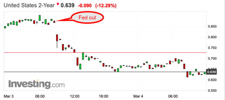 Below is the post-cut chart of the yield on the U.S. two-year Treasury note: