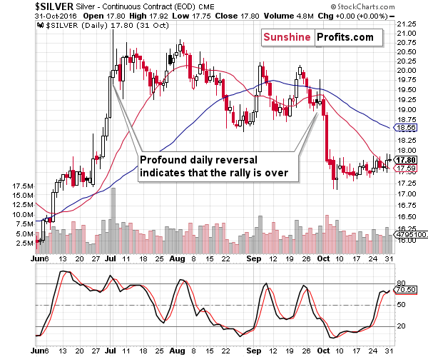 Before declining in the most profound way (in October), silver flashed the daily reversal once again, at the end of September. One could say that the mid-August session was also a daily reversal, which also had bearish implications for the following days and weeks.