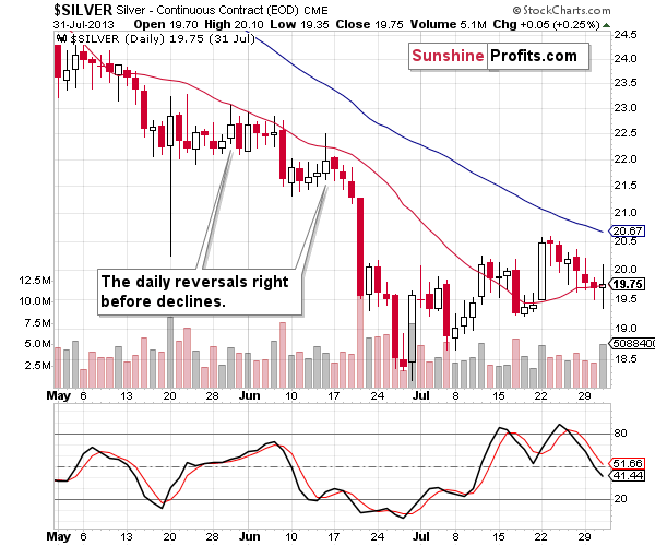 It’s mid-June 2013, and silver is after a steady decline. It just moved almost a full dollar higher during just one day, but it gave away most of these gains before the session was over. The following session opened a bit higher, but silver closed the day lower. And it declined on the next day. And the next one too. And then silver plunged almost $2 in just one day, only to decline some more in the following days. And it all started with the daily reversal.