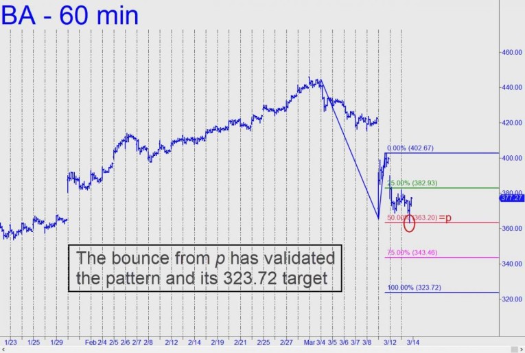 Boeing has bounced very precisely from the 363.20 midpoint pivot shown, validating the pattern and its very bearish ‘D’ target at 323.72. This means that if and when the bounce from today’s low sputters out and the stock relapses beneath 363.20, it could fall all the way to 323.72, or 14%, in search of traction. The secondary pivot at 343.46 would become our minimum downside objective at that point.