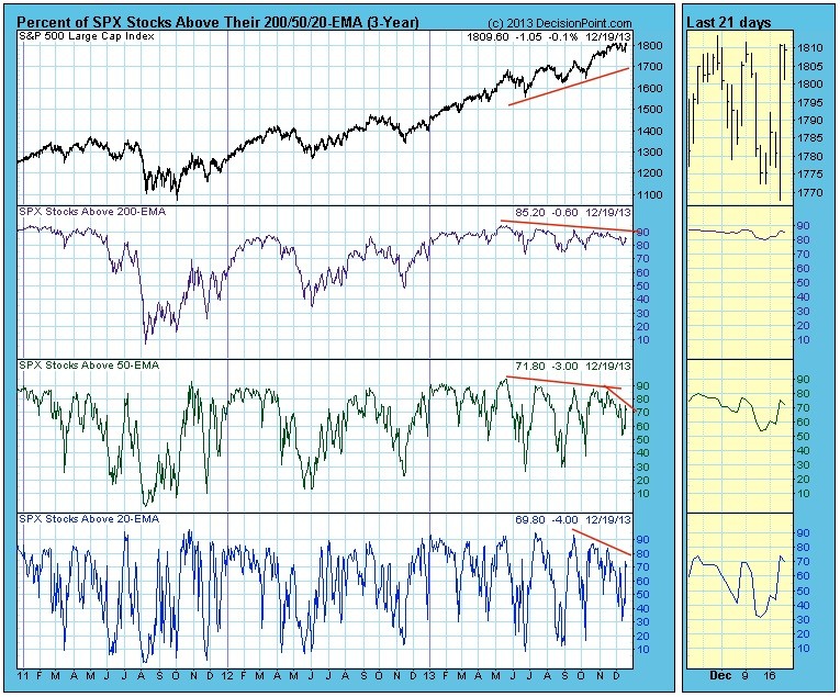 The shorter time frames (20-EMA and 50-EMA) have more severe short-term divergences. While these divergences can be eliminated if the market continues higher, they do cause concern at present.