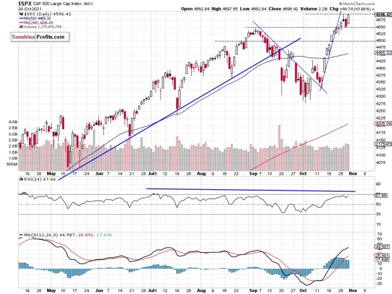 The S&P 500 index gained 0.98% on Thursday, Oct. 28, as it retraced its whole Tuesday’s-Wednesday’s decline to the support level of 4,550. It got back to the Tuesday’s record high of 4,598.53 yesterday. The daily close was just 2 points below that level. The stock market is still reacting to quarterly corporate earnings releases. Yesterday we got the releases from AAPL and AMZN, among others. But the first reaction to their numbers was negative. The market seems overbought in the short-term it is most likely fluctuating within a topping pattern.