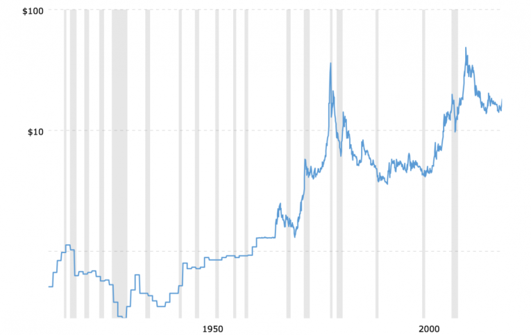 Below is a 100-year history of silver prices. Recessions are indicated by the shaded gray areas…