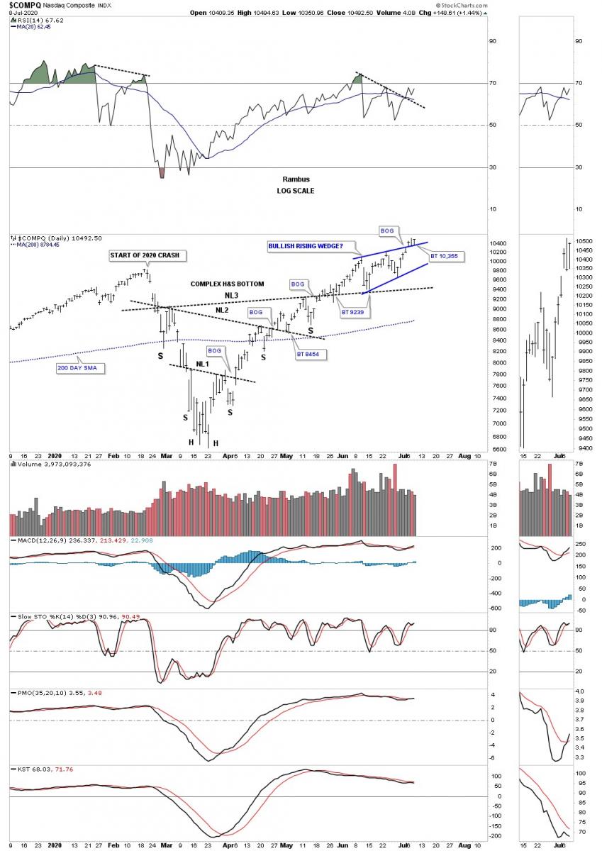 Let’s look at a few more charts which are suggesting that our current secular bull market is not dead yet. This first chart is the daily look at the COMPQ which is backtesting the top rail of its blue bullish rising wedge.