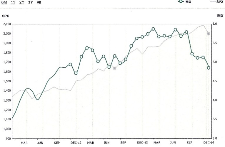 The following graph shows the Ameritrade Investor Movement Index, which tracks the amount of money retail traders are actually putting into the stock market.  As the graph illustrates, interest in the market among Ameritrade’s clients has dwindled in recent months even as the SPX was making new highs.