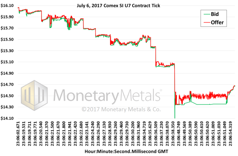 On Thursday, July 6, in the late afternoon (as reckoned in Arizona), the price of silver crashed. The move was very brief, but very intense. The price hit a low under $14.40 before recovering to around $15.80 which is about 20 cents lower than where it started.