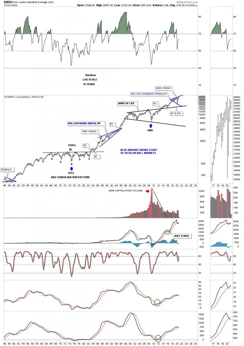 Next is the 75 year quarterly chart for the INDU which shows its secular bull markets. Back in the late 1960’s and 1970’s the INDU built out a beautiful and symmetrical H&S consolation pattern which launched the secular bull market that came to an end in 2000. You can even see the perfect backtest to the neckline after the breakout. After that nearly 25 year secular bull market that ended at the 2000 high it was time for the INDU to consolidate all those massive gains which formed the Jaws of Life. Note how close the price action came to touching the top rail of the Jaws of Life consolidation pattern during the 2020 crash. A breakout above the top rail of the blue expanding triangle will usher in the next important move higher in the secular bull market that began at the 2009 crash low.
