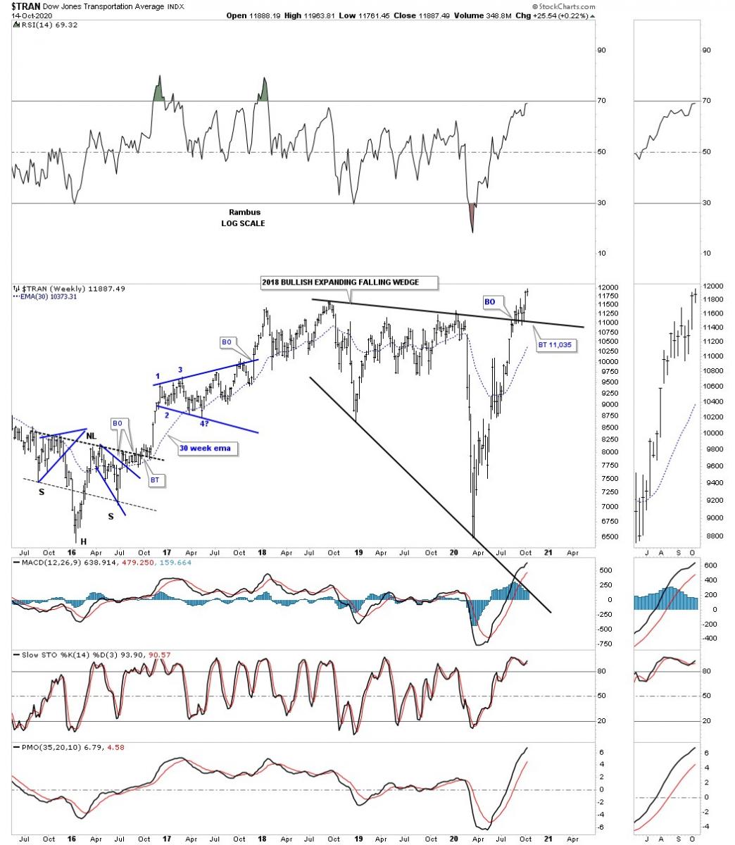 You can’t have a secular bull market without the Transportation Average participating. Below is a weekly chart which shows the price action breaking out from the 2018 bullish expanding falling wedge complete with a backtest to the top rail. You can also see the Transportation Average is trading at a new all time high.