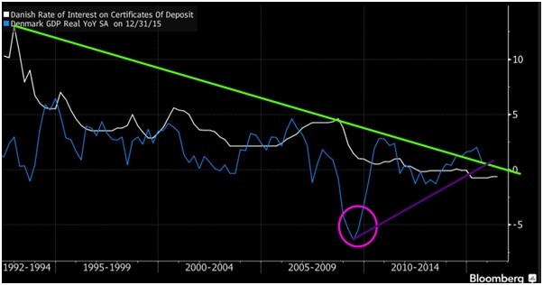 Denmark’s GDP started to rise, which is and was the whole purpose of the program. Note that shortly after the crisis of 2008-2009, rates were pushed lower faster than at any period before in the past 20 years; i.e. the lower they dropped, the higher the GDP. In fact, one can conclude that it’s in an uptrend.