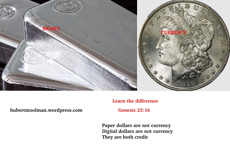 Paper dollars are not money nor currency. The same goes for digital dollars. Silver is money, and a standardized form of silver that is currently accepted as payment (generally) should be considered currency (source: Genesis 23:16).