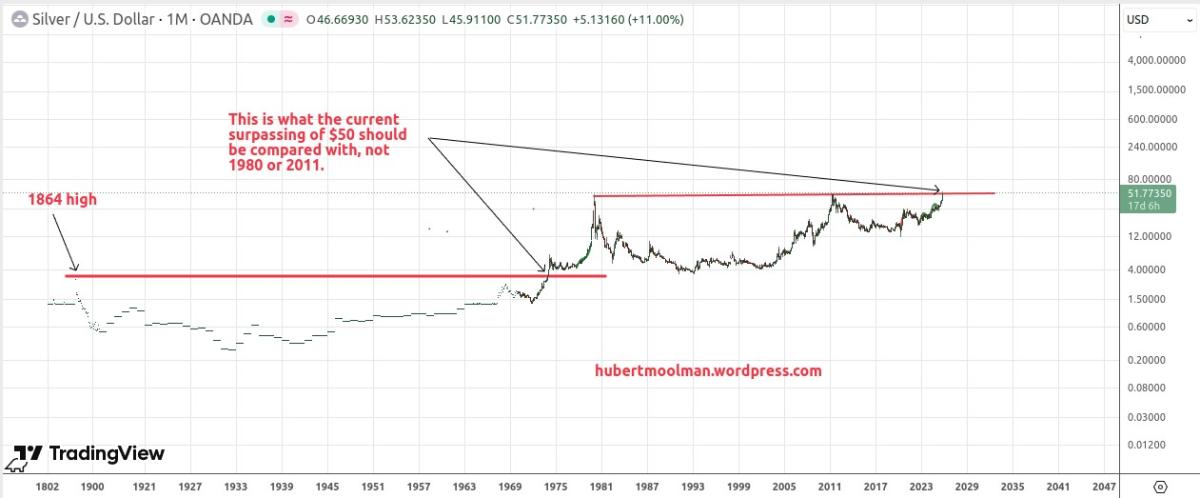 When silver hit $50, many were worried about a 1980 scenario where silver collapsed in the months that followed. This was an incorrect comparison, as silver at $50 in 2025 should rather have been compared to 1973: