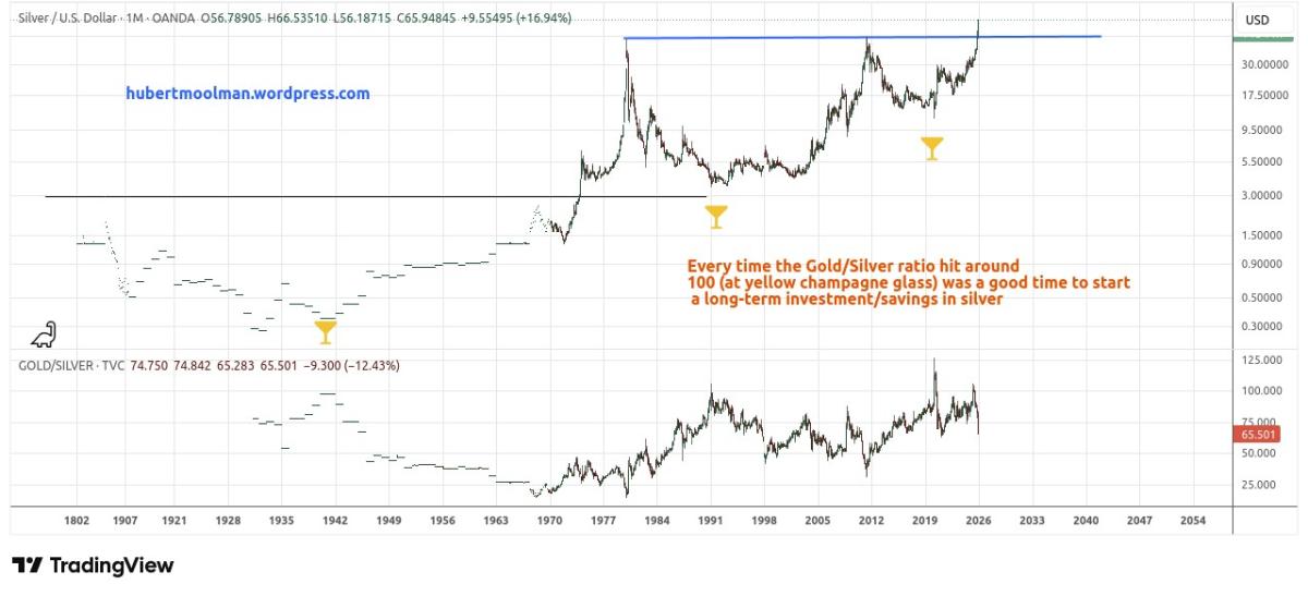 Every time the Gold/Silver ratio hit around the 100 level, it was a good time to start a long-term investment and savings strategy in silver:
