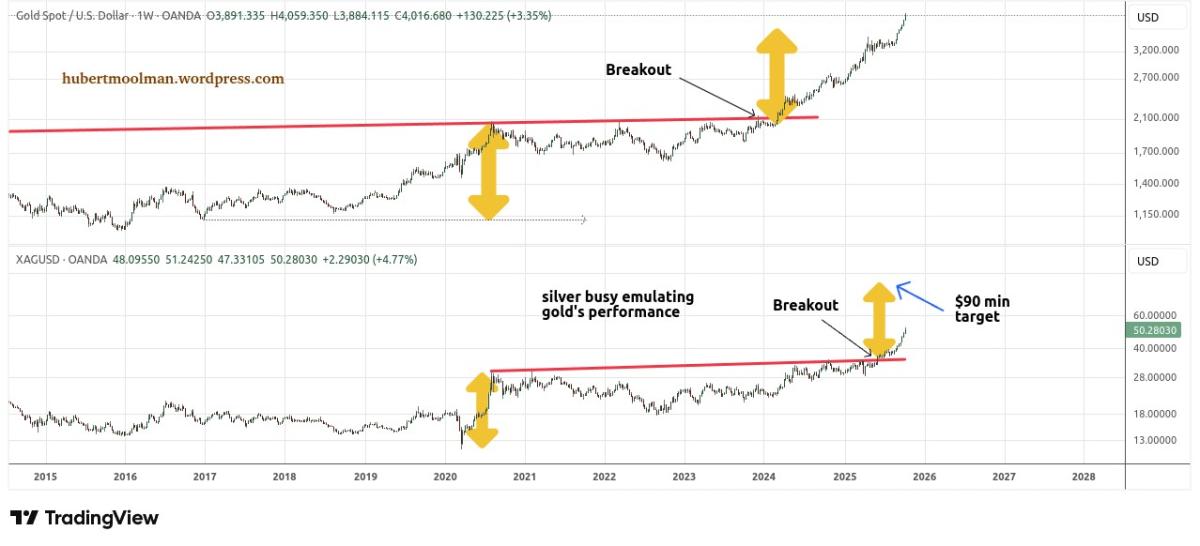 In 2024 it was gold that led the anti-dollar rallies with an important breakout in March. With the redrawn lines (in the chart below), it is clear how silver followed with a similar breakout in June 2025: