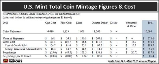 If we look at the table below, the U.S. Mint produced 10.6 billion coins in 2013: