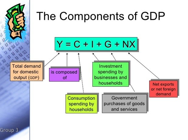 One defining formula for it is: GDP = C + I + G (+Net Exports), where C equals all consumer spending on goods and services, I equals all business spending on goods and services (wages aren’t counted to avoid double counting), and G equals all government spending on goods and services (transfer payments also are excluded to prevent double counting).