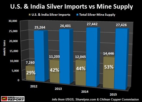 As we can see, U.S. and Indian silver imports surged to 14,446 metric tons (mt) in 2015, up 20% from 12,045 mt in 2014. This turns out to be a cool 464 million oz (Moz) of silver. Furthermore, the combined silver imports of these two countries accounted for 53% of total global mine supply. Thus the percentage of U.S. and Indian silver imports versus global mine supply continues to grow from 29% in 2012.