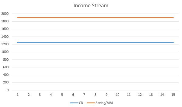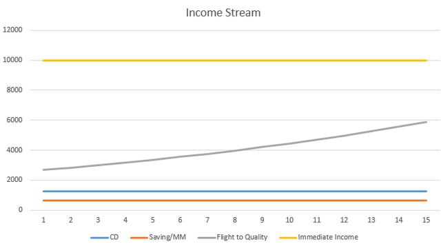 A retiree with $100,000 invested in these sources would receive only $1,250 annually or $650 annually. That's nowhere near enough to supplement other retirement sources like Social Security. However, these are very safe investments - their yields are either locked in with a CD or changing with the prime rate. We expect with a recession coming the prime rate will eventually be cut, reducing the yield of savings locked into a money market or savings account.
