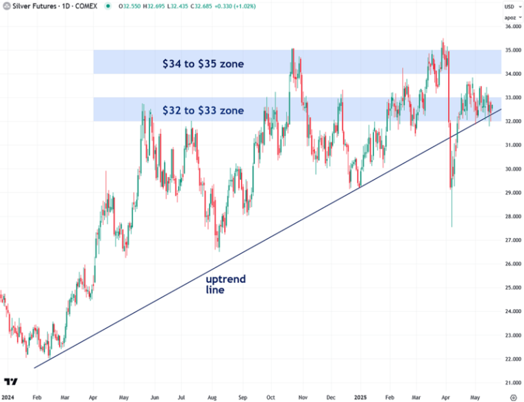 Although silver has traded in a choppy, erratic manner for much of the past year, it is in a confirmed uptrend, despite grinding higher in a frustrating “two steps forward, one step back” manner.