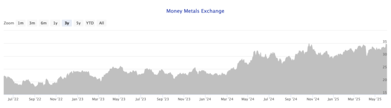 Over the last year, $35 has stood as a significant resistance level for silver. The Money Metals price chart below plots silver's nearly 100% move higher over the past three years.