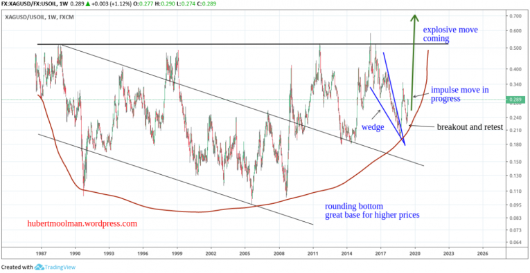 Above, is silver priced in oil from 1983 to now. Price has moved in a large channel before it broke out in 2008. This is really significant given the length of time involved.