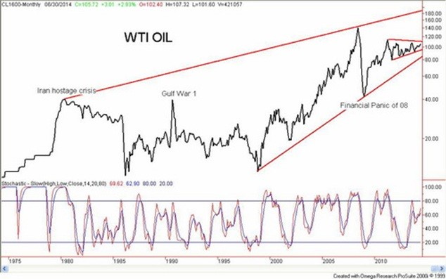 The huge pattern from 1980 appears as a huge ascending wedge triangle. Normally that is a bearish pattern. The top of the channel hooks the 1980 top up with the top of 2008. The bottom channel starts with the 1998 low and runs along the low of 2008. The top of the channel is currently near $190 while the bottom of the channel is currently near $80. There appears to be considerably more latitude for a sharp rise in oil prices as opposed to any down move. If the ascending triangle pattern is correct there appears to be considerably more ability for oil prices to rise within the triangle.