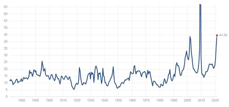Figure 1 - S&P 500 PE Ratio 1870 - 2021. Source multpl.com