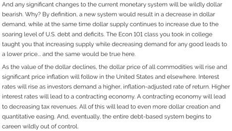 For precious metals and commodity investors, why is the movement toward de-dollarization so important? Again, remember that the U.S. dollar is the global reserve currency and its use in international settlements creates massive demand for it. If the U.S. decides to use SWIFT as a weapon of sanctions, it only serves to create demand for a separate international payments system...one which is not dollar-based. As competition takes hold, demand for dollars drops. As demand for dollars drops, the value of dollars decreases. See this screenshot from that August 2018 Sprott Money post linked above.