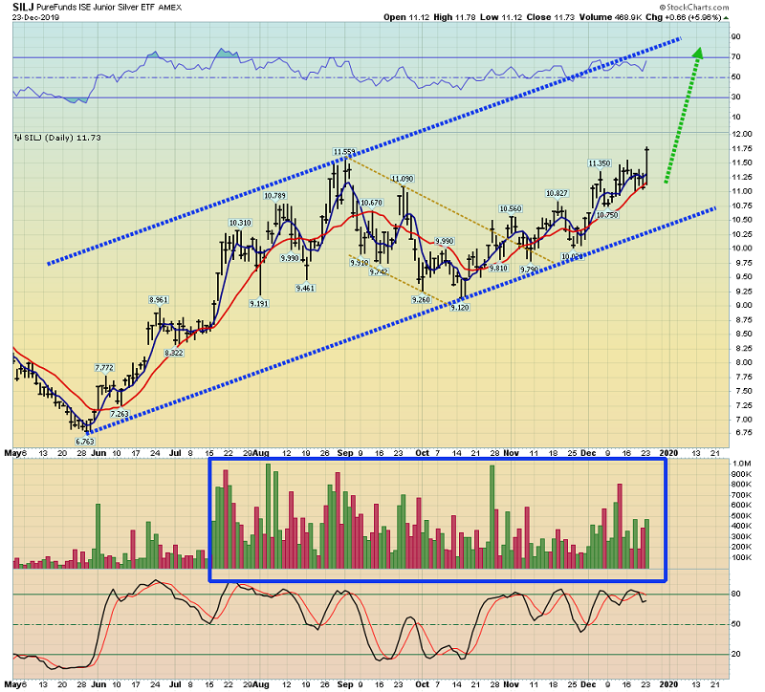 The majestic SILJ junior silver stocks chart. The up channel is technically perfect, and a surge in silver bullion would create a semi-parabolic move higher for SILJ.