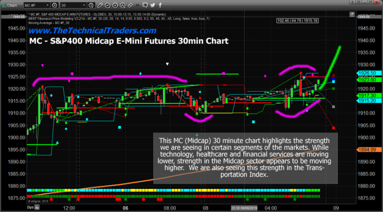 This first chart is the MC (S&P 400 Midcap) which shows how price strength in this sector moved against the overall price trend of the ES, YM, and others.  From the start of trading, the MC appeared to have a stronger upside price bias than the other US major market sectors.  This may mean that traders are finding real value in the Midcap sector and are stepping back into this sector thinking it may have some real opportunity for growth.